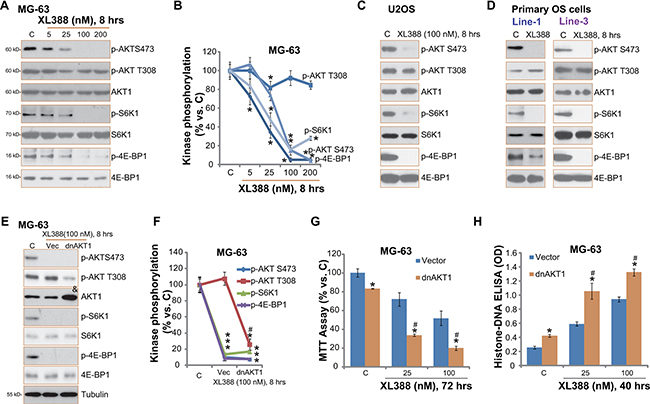 Figure 3: XL388 inactivates mTORC1/2 in OS cells. Listed OS cells were treated with applied concentration of XL388 for 8 hours, expressions of listed kinases (p- and regular) were tested by Western blots (A, C and D). Kinase phosphorylation was quantified (B). Stable MG-63 cells expressing T308A dominant negative AKT1 (“dnAKT1”) or empty vector (“Vec”, pcDNA3-puro) were treated with or without XL388, cells were further cultured, expressions of listed kinases were tested by Western blots (E), kinase phosphorylation was quantified (F); Cell survival and apoptosis were tested by MTT assay (G) and histone DNA ELISA assay (H), respectively. n = 3 for each assay. *p < 0.05 vs. group “C”. #p < 0.05 vs. “Vec” group (F–H).