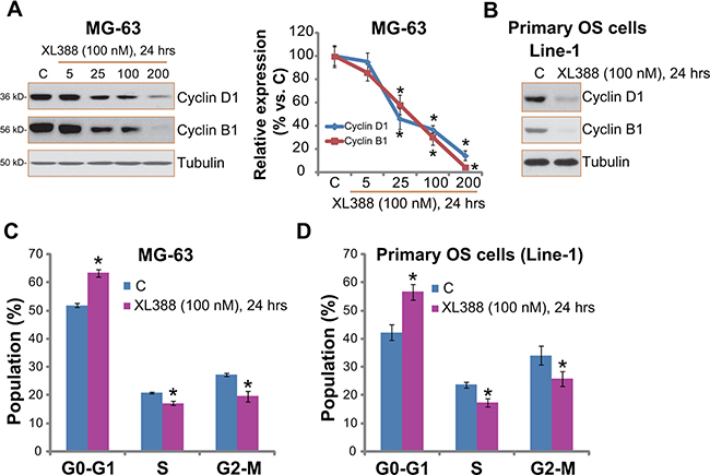 Figure 4: XL388 inhibits OS cell cycle progression. Listed OS cells were treated with applied concentration of XL388 for 24 hours, cyclin B1/D1 expression was tested by Western blots (A and B); Quantitative cell cycle distribution was examined by FACS assay (C and D). n = 3 for each assay. *p < 0.05 vs. group “C”.