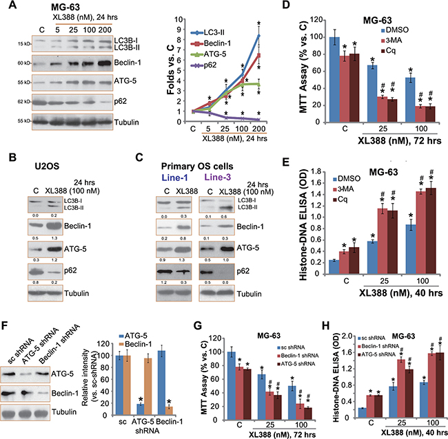 Figure 5: XL388 activates autophagy in OS cells. Listed OS cells were treated with applied concentration of XL388 for 24 hours, expression of listed proteins was tested by Western blots (A–C), quantification was also performed (A–C). MG-63 cells, pre-treated with 3-methyladenine (3-MA, 0.5 mM), chloroquine (Cq, 10 μM), or 0.1% of DMSO (“DMSO”) for 1 hour, were treated with XL388 (25/100 nM) for applied time, cell survival and apoptosis were tested (D and E). Stable MG-63 cells, expressing scramble shRNA (“sc shRNA”), Beclin-1 shRNA or ATG-5 shRNA (see Beclin-1/ATG-5 expression in (F), were treated with or without XL388 (25/100 nM) for applied time, cell survival and apoptosis were tested (G and H). n = 3 for each assay. *p < 0.05 vs. group “C”. #p < 0.05 vs. “DMSO” group (D–E). #p < 0.05 vs. “sc shRNA” group (G–H).