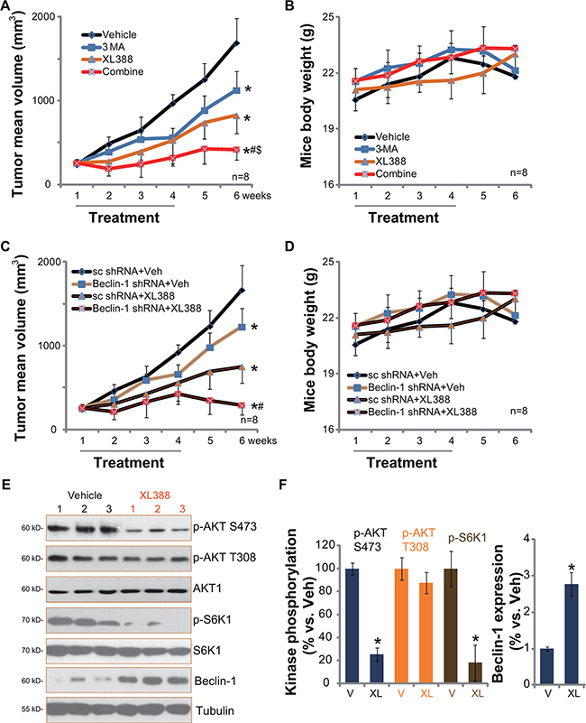 Figure 6: XL388 inhibits U2OS xenografts growth in vivo, its activity is further enhanced with autophagy inhibition. The U2OS bearing SCID mice (11 mice per group) were administrated with vehicle (“Veh”, saline), XL388 (20 mg/kg, oral gavage, every three days, × 7 times), or plus 3-MA (20 mg/kg, i.p. every three days, × 7 times), tumor size was measured every week for a total of 6 weeks (A). Mice body weight was also recorded (B). Two weeks after initial drug administration, xenografted tumors of three mice per group were isolated and subjected to Western blot assay (E, and quantified in F) of listed proteins. Stable U2OS cells expressing scramble control shRNA or Beclin-1 shRNA were injected into SCID mice to establish xenograft model, mice were then treated once daily with vehicle (saline) or XL388 (20 mg/kg, oral gavage, every three days, × 7 times), tumor size (C) and mice body weights (D) were presented. *p < 0.05 vs. “Veh” or “V” group (A and F). #p < 0.05 vs. XL388 only group (A). $p < 0.05 vs. 3-MA only group (A). *p < 0.05 vs. “Veh” of “sc shRNA” group (C). #p < 0.05 vs. XL388 of “sc shRNA” group (C).