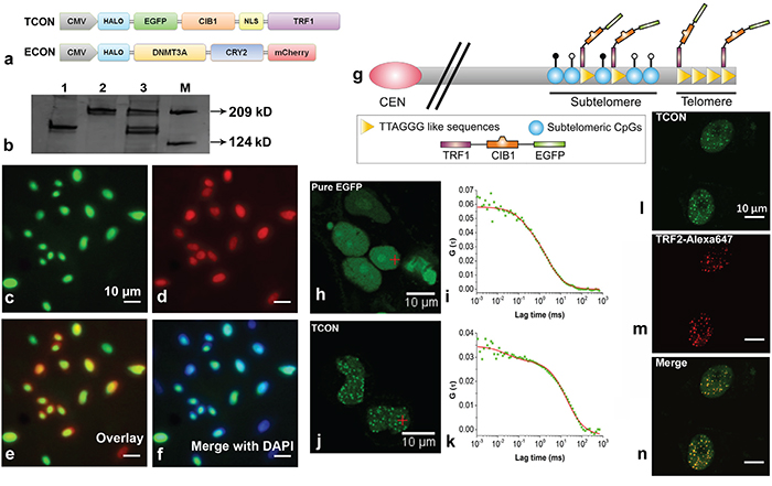 Figure 1: Telomere targeting of TCON and nuclear co-localization with ECON. a. Schematic of the HALO tagged TCON and ECON fusion proteins, b. Western blot analysis demonstrates production of intact TCON (~149 kD; lane-1), ECON (~223 kD; lane-2), and TCON plus ECON (lane-3) fusion proteins in HeLa cells. Representative images showing the nuclear localization of TCON c. ECON d. their co-localization e. and their overlap with DAPI stained nucleic acids f. g. Schematic showing the binding of TCON to the telomeric repeat sequences through TRF1. FCS measurements showed the distinct distribution and diffusion pattern of TCON tagged EGFP j, k. in comparison to the control EGFP h, i. Co-localization of TCON and TRF2 is revealed using the overlapping fluorescence of EGFP of TCON and Alexa-647 TRF2 (m) antibody bound to TRF2 l, m and n. in HeLa cells. Because TRF2 is telomere specific binding protein, the co-localization of TCON to the same locus reveals the association of TCON with telomeres.