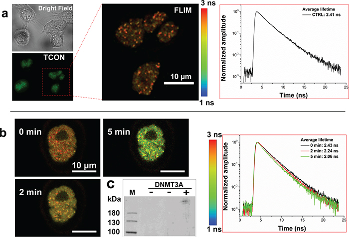 Figure 2: Blue light induced association of optogenetic fusion proteins. a. Fluorescence lifetime analysis of EGFP component of TCON fusion protein in transiently transfected HeLA cells using FLIM-FRET. Fluorescence lifetime was estimated to be 2.41 ns. b. Blue-light induced change in fluorescence lifetime of EGFP component of TCON fusion in the presence of ECON. Representative HeLA cells co-transfected with TCON and ECON constructs was exposed to 8 mW/cm2 of blue light for the indicated time periods. Fluorescence lifetime decreases from 2.43 ns to 2.06 ns over a 5 min exposure to blue light, due to the FRET between EGFP and mCherry, validating the optically induced association of CRY2PHR and CIB1 that are components of TCON and ECON fusions respectively. c. Western blot analysis of co-immunoprecipitated fraction from cells transfected with either TCON, or TCON and ECON treated with presence (+) and in the absence (-) of blue light. Immunoprecipitation was carried out using EGFP antibody, whereas DNMT3A antibody was used for the detection of pulled-down ECON in Western blot. An ECON specific band (ca. 223 kDa) was observed in the blot in the protein fractions of co-transfected illuminated cells (lane-3). In contrast, no anti-DNMT3A Ab specific band was detected in cells transfected with TCON (lane-1) or co-transfected cells lacking light treatment (lane-2). Data shows that blue-light treatment promotes the formation of complexes between TCON and ECON.