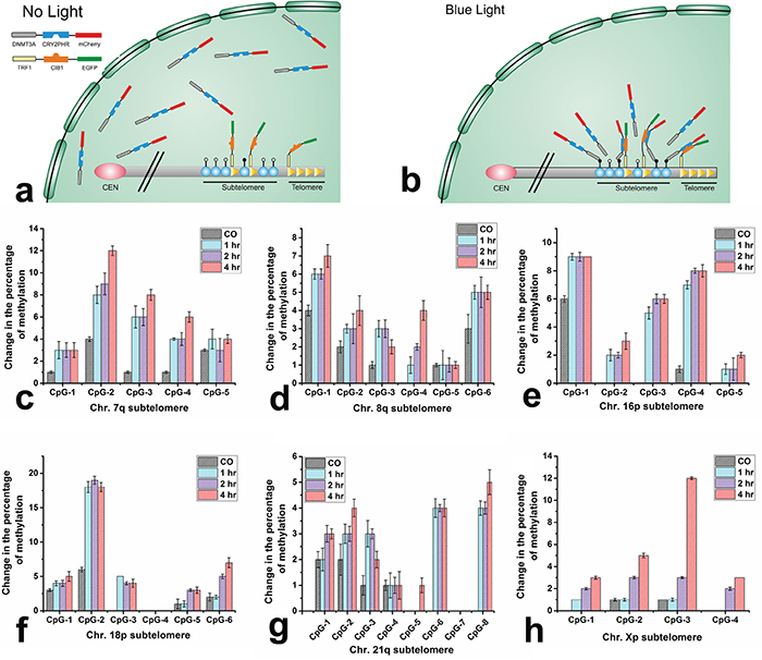 Figure 3: Blue light induced DNA-methylation at the subtelomeres. Schematic showing that, ECON fusion proteins move freely within the nucleus in the absence of light a. however, their accumulation at the telomeric and subtelomeric sites is triggered by blue light driven association to the TCON fusion proteins bound to the ends of chromosome b. Analysis of changes in DNA methylation at selected subtelomeric CpG sites. The extent of changes in methylation was compared between co-transfected cells that were either untreated or illuminated for 1, 2, and 4 hr. Methylation levels were measured by pyrosequencing and expressed as % change at the subtelomeric region of chromosome 7q c. 8q d. 16p e. 18p f. 21q g. and Xp h. Varying levels of increase in methylation at distinct CpG loci was observed after blue light treatment for 1 hr, 2hr, or 4 hr. compared to the co-transfected (CO) cells without any illumination.