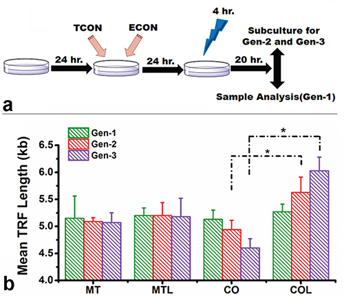 Figure 4: Change in telomere length and telomerase activity. Schematic of the light-dark cycle, subjected to three generation of cells before telomere length measurement a. Telomere length was evaluated among the replicates of mock transfected (MT) and co-transfected (CO) cells both in absence or presence of blue light (L) (for 4 hr) over three consecutive generations; using Southern Blotting b. Treated cells were incubated for 24 hour of post-illumination, and subjected to telomere length measurements. Telomere length did not change significantly among mock transfected cells either in the presence or absence of light. Telomere length slightly decreased in co-transfected cells without illumination over generations. By contrast, a progressive increase in telomere length was observed for the blue light illuminated co-transfected cells. The change in telomere length between light treated and non-light treated CO cells was significant (p < 0.05) at the end of 2nd and 3rd generation of treatment.