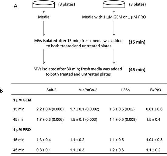 Figure 1: GEM treatment triggers pancreatic cancer cells to release MVs, which correlates to the cells’ ability to resist GEM. A. Illustration of the experiment. B. After treatment, MVs were isolated from the cells after 15 min and 45 min and were quantitated based on their surface proteins. P values are compared with their respective untreated group. Results are presented as mean ± SD. GEM = gemcitabine; PRO = procainamide.
