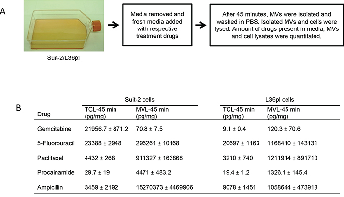 Figure 3: Microvesicles contain therapeutic drugs. A. Experimental illustration for isolation of MVs released by Suit-2 and L36pl cells. B. The amount of drugs present in the media, in total cells, and in released MVs was estimated with HPLC-MS/MS and is expressed as pg/mg of total proteins. Results are presented as mean ± SD. Experiments were repeated twice, in duplicate. Estimation of drugs in ng/mL is in Supplemental Fig. S2. TCL = total cell lysates; MVL = MV-lysates.