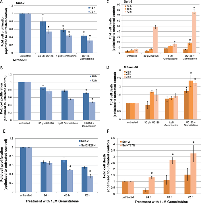 Figure 4: Inhibition of MV-release sensitizes drug-resistant pancreatic cancer cells to GEM in vitro. A. Suit-2 cells and B. MPanc-96 cells were treated with either 30 μM U0126 or 1 μM GEM or both. Cell proliferation was determined after 48 h and 72 h. C. Suit-2 cells and D. MPanc-96 cells were treated as before and analyzed for cell death after 24, 48, and 72 h by flow analysis. *P < 0.05, compared to 30 μM U0126 alone, at respective time points. E. Suit-2 and Suit-2T27N cells were treated with 1 μM GEM and cell proliferation was determined after 24, 48, and 72 h. F. Cell death in Suit-2 and Suit-2T27N cells treated with 1 μM GEM was assessed with flow analysis. *P < 0.005, compared to Suit-2. Results are presented as mean ± SD. Experiments were repeated thrice, in duplicate.