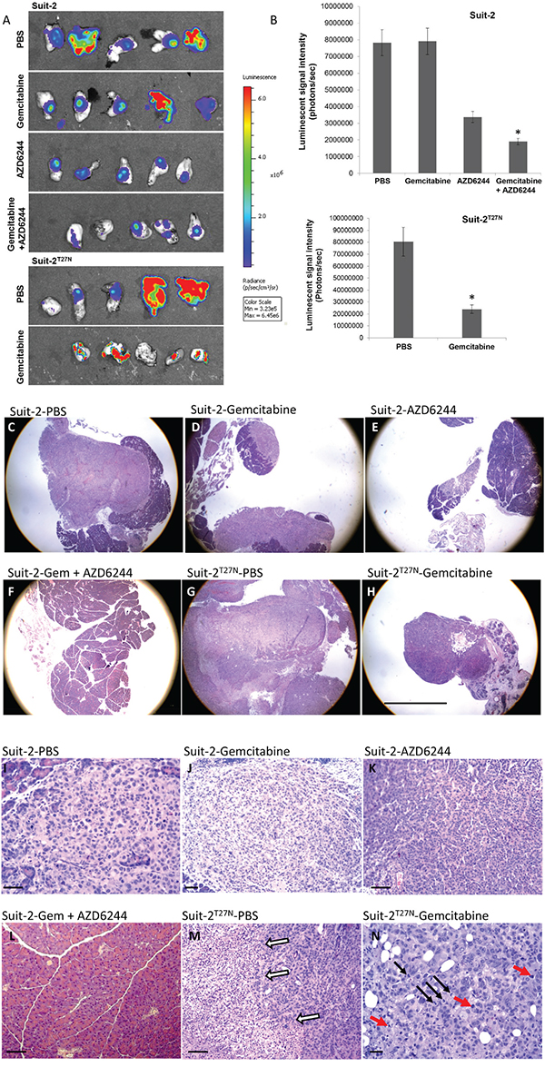 Figure 5: Inhibition of MV-release sensitizes orthotopically implanted GEM-resistant pancreatic tumors to GEM. A. Bioluminescence imaging of tumors from each group. B. Quantification graphs. *P < 0.005 compared to AZD6244 (Suit-2 tumor, top panel) or PBS-treated group (Suit-2T27N tumor, bottom panel). Results are presented as mean ± SE. Representative C-H. low magnification and I-N. high magnification histopathology images from each group. C, E, G and H show larger tumor masses with extensive central necrosis. D shows a small tumor mass at the edge of the pancreas and a smaller tumor in the same organ. Most of the transplanted tumors are made up of small epithelial cells that grow in solid masses as seen in I and J and sometimes a slight glandular pattern as shown in K. Sections in F and L show an essentially normal pancreas. White arrows in M indicate the border between viable tumor on the right and necrosis on the left. In N the red arrows point to apoptosis and the black arrows to mitoses. The scale bar represents 20 mm. The scale bars for I, K, L, and M are 3 times larger and in N is 4 times larger.