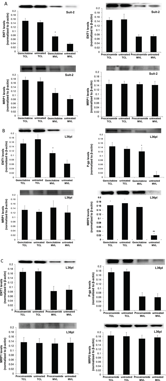 Figure 7: GEM treatment increases expression of efflux and influx proteins on MVs. A. MVs were isolated from Suit-2 cells treated with GEM or procainamide. Equal amounts of lysates from MVs and cells were tested for ENT1 and MRP1. MVs were isolated from L36pl cells treated with GEM B. or procainamide C. Equal amounts of lysates from MVs and cells were tested for ENT1, MRP1, P-gp, and MRP5. All the blots were re-probed for β-actin for normalization and graphed. Experiments were repeated thrice. The mean value is plotted as ± SD. *P<0.05, **P<0.005 compared to untreated. MVL= microvesicle lysates; TCL= total cell lysates. The blots showing the relevant bands have been cropped to minimize the blot size.