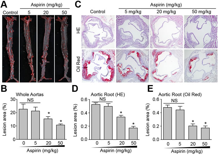 Aspirin is used to reduce the risk of CVD in secondary prevention [18]. We firstly tested the dose-response of aspirin (5, 20, or 50 mg/kg/day) on the suppression of atherosclerotic lesion formation in Apoe-/- mice fed a high fat diet for 8 weeks as described previously [19]. The atherosclerotic plaques in whole aortas (Figure 1A, 1B) and aortic roots (Figure 1C-1E) were determined by Oil Red staining or HE staining. As indicated in Figure 1A-1E, 5 mg/kg/day aspirin did not reduce the size of atherosclerotic plaque, consistent with previous reports indicating that this dose of aspirin is ineffective [9]. However, 20 and 50 mg/kg/day aspirin significantly decreased the size of atherosclerotic plaques in whole aortas and aortic roots, consistent with a recent report [20]. An aspirin dose response was evident with 50 mg/kg/day aspirin substantially suppressing atherosclerotic formation compared to 20 mg/kg/day aspirin. These data indicate that aspirin has the potential to produce anti-atherosclerotic effect in vivo.