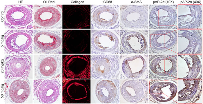 The collar placement was used to induce atherosclerotic vulnerable plaque in Apoe-/- mice. Briefly, a constrictive silastic tube was placed around the left common carotid artery near its bifurcation in mice fed with a high fat diet. Lentivirus infection was performed 4 weeks prior to aspirin administration (5-50 mg/kg/day). For analyzing the lesion area, the tissue was embedded in freezing medium and sectioned. Four consecutive sections were collected from each mouse and stained with Oil Red O or HE. The plaque vulnerable index in carotid artery was calculated according to the ratio of area I (Oil Red+ + CD68+) to area II (α-SMA+ + Collagen+).
