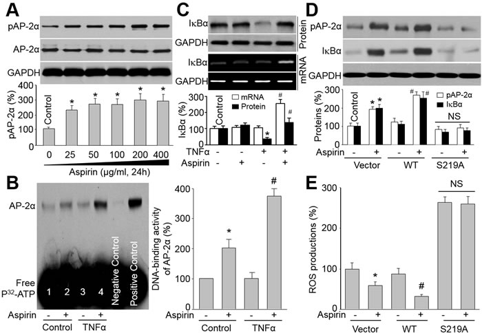 Figure 5: Aspirin via AP-2α upregulates IkBa levels in VSMCs. A. Cultured VSMCs were treated with 25-400 μg/ml aspirin (24 hours). Cell lysates were immunoblotted with anti-phosphorylated AP-2α antibody. *P < 0.05 vs. Control. (B and C) VSMCs were treated with TNFα (10 ng/ml, 24 hours) plus aspirin (200 μg/ml). Cells were subjected to detect AP-2α DNA-binding activity by EMSA in B and the levels of IkBa protein and mRNA by Western blot or RT-PCR in C. *P < 0.05 vs. control. #P < 0.05 vs. TNFα alone. (D and E) VSMCs were infected with adenovirus vector containing cDNA of WT-AP-2α or S219A-AP-2α for 48 hours. After that, cells were incubated with or without aspirin (200 μg/ml) for 24 hours. Cell lysates were harvested to assay protein level of IkBa by Western blot in D and ROS productions by DHE/HPLC in E. N is 3 in each group. *P < 0.05 vs. Vector alone. #P < 0.05 vs. WT-AP-2α alone. NS indicates no significant difference.