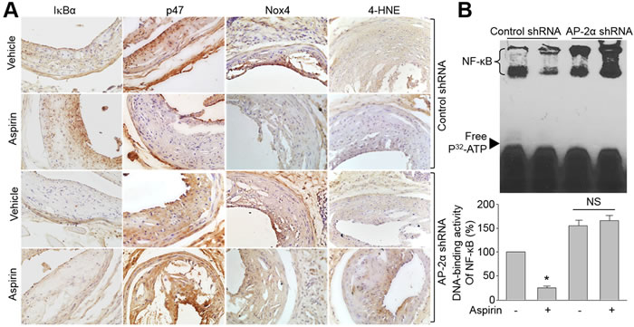 Figure 6: Knockdown of AP-2α abolishes the effects of aspirin on IkBα gene expression, NAD(P)H oxidase protein expressions, and oxidative stress in Apoe−/− mice with vulnerable atherosclerotic plaque. The protocol and experimental designs were described in Supplementary Methods and Figure S2C. A. Protein expressions of IkBα, Nox4, p47, and 4-HNE by IHC staining were determined. The picture shown is a representative picture from 10-15 mice in each group. B. Quantitative analysis of NF-kB DNA-binding activity in mice carotid arteries assayed by EMSA. Data were expressed by mean ± SEM. N is 10-15 in each group. *P < 0.05 vs. control shRNA alone. NS indicates no significance.