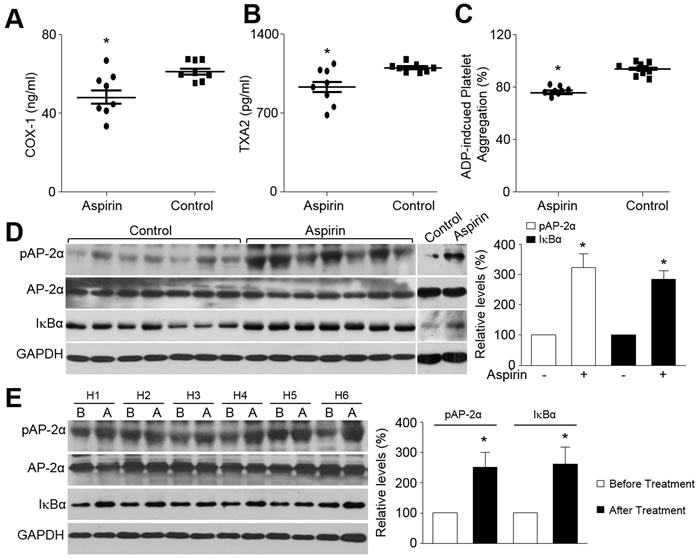Finally, to address if the conventional dose of aspirin activates AP-2α and upregulates IkBα protein level in humans, we assayed AP-2α phosphorylation and IkBα protein in humans. The compliance to aspirin treatment was assessed by determining the platelet cyclooxygenase 1 activity. As indicated in Figure 7A-7C, aspirin at the dose of 100 mg/day remarkably reduced both the COX-1 activity and the plasma TXA2 level in human subjects, and inhibited ADP-induced platelet aggregation. As expected, the levels of pAP-2α and IkBα protein in leucocytes were much higher in patients taking aspirin than those non-aspirin controls (Figure 7D). Due to probable interindividual differences, we also tested the levels of pAP-2α and IkBα protein in the same person. Similarly, the levels of pAP-2α and IkBα protein were increased after aspirin administration, compared to those before aspirin treatment (Figure 7E). Collectively, these data demonstrate that aspirin at conventional dose is able to activate AP-2α/IkBα pathway in humans, revealing the high clinical relevance of our experimental observations.