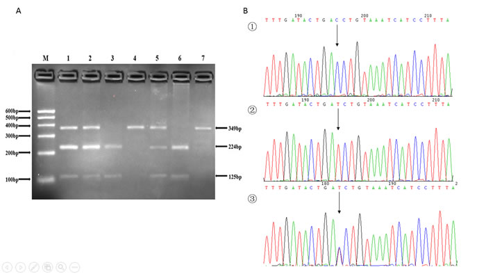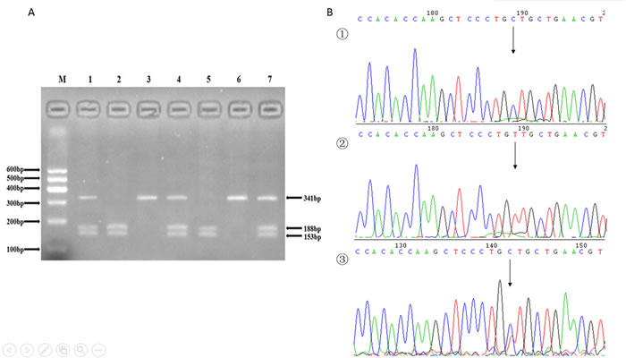 Figure 3: A. The restriction fragment length polymorphism analysis to determine rs16893344 C > T polymorphism, the CC genotype shows two bands at 153 bp and 188 bp (2 and 5); the TT genotype shows one 341 bp band (3 and 6); and the CT genotype shows three bands at 153 bp, 188 bp and 341 bp (1, 4 and 7). B. Nucleotide sequences around rs16893344 C > T polymorphism ((1), CC genotype; (2), TT genotype; (3), CT genotype).