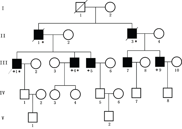Figure 1: Pedigree structure of the Chinese family with familial adenomatous polyposis. Family members with FAP are indicated with Shading. Squares and circles denoted males and females respectively. Individuals labeled with a solidus were deceased. Family members with CRC are indicated with asterisks. Family members detected with APC gene deletion are indicated by “four angled star”. Roman numerals indicate generations. Arrow indicates the proband (III-1).