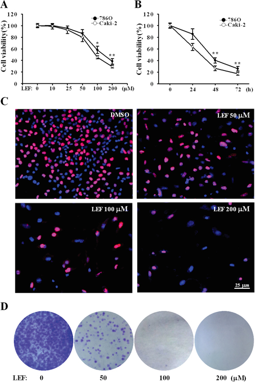 Figure 1: LEF reduces cell viability and cell growth in RCC cells. A. Cell viability was estimated by MST assay after Caki-2 and 786O cells were incubated with increasing concentrations of LEF for 48 h. DMSO was used as a control. B. The time-response curve of 200 μM LEF on cell viability of Caki-2 and 786O cells. Data in A and B represent mean ± SD from three independent experiments (*P<0.01, ** P<0.05, vs. the control). C. EdU incorporation assay was analyzed by fluorescence microscopy in Caki-2 cells treated with elevated concentrations of LEF (0-200 μM) for 48 h. Nuclei were visualized with Hoechst 33342. D. Representative images of cell colony formation assay to evaluate the long-term growth inhibition effects of LEF. Caki-2 cells were maintained in indicated concentrations of LEF for 7 days before staining with crystal violet.