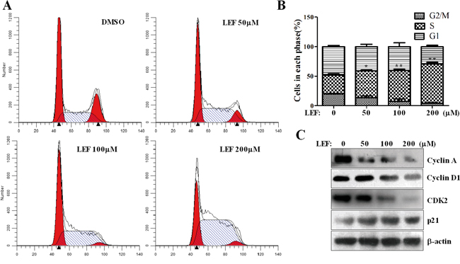 Figure 2: LEF induces cell-cycle arrest. A. After LEF treatment for 48 h, Caki-2 cells were stained with PI and subjected to cell cycle analysis by flow cytometry. One representative experiment out of three is shown. B. The statistical analysis of cell percentage of cell-cycle distribution. Data represent mean ± SD of three independent experiments (*P<0.01, ** P<0.05, vs. the control). C. Changes in cell-cycle regulatory proteins after LEF treatment for 48 h. Representative images from at least three independent experiments are shown.