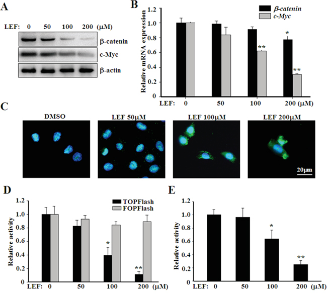 Figure 4: LEF inhibits canonical WNT/β-catenin signaling. A. Western blot assay showing dose-dependent effect of LEF on β-catenin and c-Myc protein levels in Caki-2 cells. B. Real-time PCR for the expression of β-catenin and c-Myc mRNA levels. Data represent mean ± SD from three independent experiments. C. LEF induced the translocation of β-catenin from the nucleus into the cytoplasm in Caki-2 cells. D. Luciferase assay to estimate the activation of canonical WNT/β-catenin signaling. Caki-2 cells were transiently transfected with TOPFlash or FOPFlash constructs (1 μg), both in combination with pRSVluc plasmid as an internal control. 6 h after transfection, cells were subsequently treated with depicted concentrations of LEF for another 48 h. E. The transcriptional activity of c-Myc promoter was analyzed by luciferase reporter assay. Luciferase activity in D and E was measured and normalized to Renilla luciferase activity. All experiments were done in triplicates and each bar represents mean ± SD (*P<0.01, ** P<0.05, vs. the control).