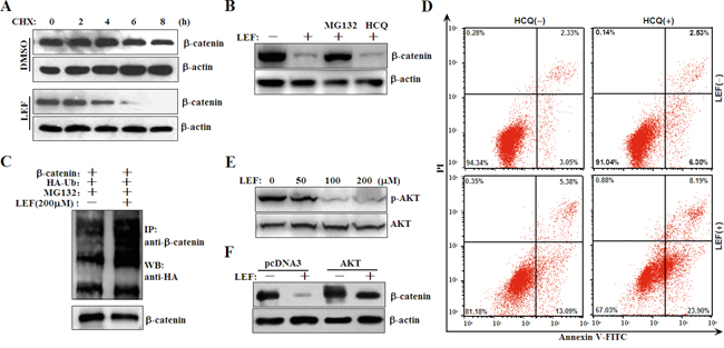 Figure 5: LEF represses AKT kinase to induce β-catenin degradation. A. Accelerated degradation of β-catenin protein after LEF treatment in Caki-2 cells. Caki-2 cells were treated with 200 μM LEF for 48 h, and then incubated with 20 μM CHX for indicated periods. The cell extracts were subjected for Western blot to analyze the rate of β-catenin degradation. B. Caki-2 cells were treated with 200 μM LEF together with 10 μM MG132 or 10 μM HCQ for 48 h. C. Ubiquitylation of β-catenin by LEF. Caki-2 cells were transfected with β-catenin together with HA-tagged ubiquitin (HA-Ub) vectors. Immunoprecipitation was conducted with anti-β-catenin and subsequently immunoblotting analysis was performed with anti-HA antibodies. D. Flow cytometry analysis of apoptosis was determined in Caki-2 cells treated with 200 μM LEF and 10 μM HCQ for 48 h. Data are typical of three similar experiments. The percentage of Annexin V-FITC and/or PI positive cells was depicted with cytofluorometer quadrant graphs. E. Western blot detected the protein levels of phosphorylated and total AKT in Caki-2 cells treated with 200 μM LEF for 48 h. F. Caki-2 cells were transfected with AKT plasmids or the control constructs, and then cells were treated with 200 μM LEF for 48 h to detect the degradation of β-catenin with Western blot. Representative images from at least three independent experiments are shown.