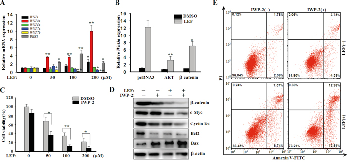 Figure 6: LEF upregulates WNT ligands to compromise cytotoxic effects. A. Real-time PCR for the expression of WNT1, WNT3a, WNT5a, WNT7a, WNT7b, and DKK1 in mRNA levels. Data represent mean ± SD from three independent experiments. B. Caki-2 cells were transfected with plasmids encoding AKT or β-catenin as depicted, and then cells were treated with 200 μM LEF for 48 h to detect the expression of WNT3a mRNA by real-time PCR. C. Cell viability was estimated by MST assay after Caki-2 acells were incubated with increasing concentrations of LEF together with 20 μM IWP-2 for 48 h. All experiments were done in triplicates and each bar represents mean ± SD (*P<0.01, ** P<0.05, vs. the control). D. Changes of growth and apoptosis-associated proteins after combined treatment of LEF and IWP-2 for 48 h. Representative images from at least three independent experiments are shown. E. Flow cytometry analysis of apoptosis was determined in Caki-2 cells treated with 200 μM LEF and 20 μM IWP-2 for 48 h. Data are typical of three similar experiments. The percentage of Annexin V-FITC and/or PI positive cells was depicted with cytofluorometer quadrant graphs.