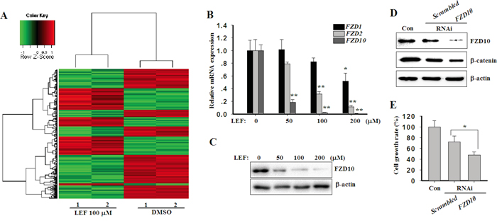 Figure 7: LEF decreases the expression of FZD10. A. Heatmap of hierarchical clustering of gene expression from Caki-2 cells treated with 200 μM LEF or vehicle control. B. Real-time PCR for the expression of FZD1, FZD2, and FZD10 in mRNA levels after LEF treatment. Data represent mean ± SD from three independent experiments C. Changes of FZD10 proteins after LEF treatment for 48 h. D. Caki-2 cells were transfected with FZD10 or scrambled siRNAs respectively. After 48 h, western blot detected the protein levels of FZD10 and β-catenin. Representative images from at least three independent experiments are shown. E. Cell growth was estimated by MST assay after siRNA transfection for 72 h. (*P<0.01, ** P<0.05, vs. the control).