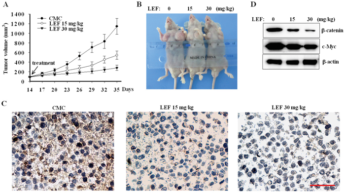 Figure 8: LEF suppresses xenograft tumors in mice model. A. The rates of xenograft growth were monitored at indicated days in NOD/SCID mice receiving LEF or vehicle. Error bars represent standard deviations, n = 8. B. Tumor samples showing final tumor size after mice were sacrificed. C. Representative immunohistochemical staining of FZD10 in xenograft tissues. Scale bar 50 μm. D. Immunoblotting analysis of β-catenin and c-Myc from xenograft tumors treated with LEF or vehicle (n = 5). One representative experiment out of three is shown.