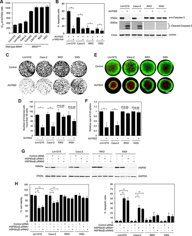We have previously shown that the HSP90 inhibitor AUY922 kills colon cancer cells through apoptosis and that wild-type KRAS colon cancer cells are more resistant to apoptosis induced by AUY922 compared with those carrying active mutations in KRAS [29]. In subsequent studies, we found that among wild-type KRAS colon cancer cells, those harbouring active mutations in BRAF were even more resistant to AUY922-induced apoptosis than cells with wild-type BRAF (Figure 1A and 1B). The half-maximum inhibitory concentration (IC50) values were > 800 nM in Colo205, LS411N, RKO and WiDr cells (mutant BRAF) compared with 326–458 nM in Lim1215, Lim1863, and Caco-2 cells (wild-type BRAF) (Figure 1A). The difference in the sensitivity of mutant compared to wild-type BRAF colon cancer cells to AUY922-induced apoptosis was also reflected in clonogenic assays and in cells grown in 3-dimensional cultures (Figure 1C–1F). Similar to AUY922, knockdown of the major isoforms of HSP90, HSP90α/β induced cell death in wild-type BRAF colon cancer cells, but did not significantly impinge on survival of mutant BRAF colon cancer cells (Figure 1G and 1H) [15, 30]. Moreover, mutant BRAF colon cancer cells were also relatively resistant to the other HSP90 inhibitor, XL888 (Supplementary Figure S1) [31].
