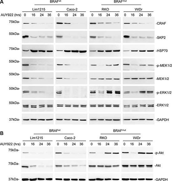 Figure 2: Resistance of mutant BRAF colon cancer cells to AUY922 is associated with rapid recovery of ERK and Akt activation . (A) Whole cell lysates from Lim1215, Caco-2, RKO and WiDr cells treated with AUY922 (400 nM) for indicated time points were subjected to Western blot analysis. Data are representative, n = 3. (B) Whole cell lysates from Lim1215, Caco-2, RKO and WiDr treated with AUY922 (400 nM) for indicated time points were subjected to Western blot analysis. Data are representative, n = 3.