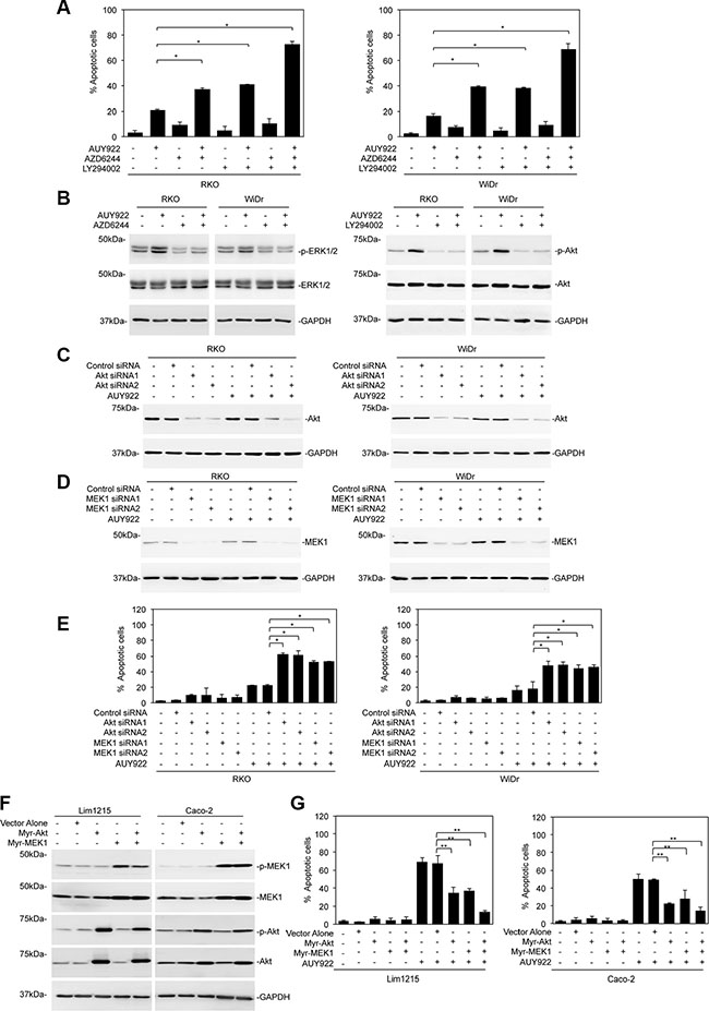 Figure 3: Reactivation of ERK and Akt is responsible for resistance of mutant BRAF colon cancer cells to AUY922. (A) RKO (left) and WiDr (right) cells were pre-treated with AZD6244 (1 μM) and LY294002 (40 μM) for 1 hour before addition of AUY922 (400 nM) for further 48 hours. Apoptosis was measured by PI and Annexin V staining. Data are mean ± SE, n = 3. *P < 0.05, Student’s t-test. (B) Whole cell lysates from RKO and WiDr cells pre-treated with AZD6244 (1 μM) and LY294002 (40 μM) for 1 hour before addition of AUY922 (400 nM) for further 48 hours were subjected to Western blot analysis. Data are representative, n = 3. (C) Whole cell lysates from RKO (left) and WiDr (right) cells transfected with the control or Akt siRNAs were treated with AUY922 (400 nM) for 48 hours and subjected to Western blot analysis. Data are representative, n = 3. (D) Whole cell lysates from RKO (left) and WiDr (right) cells transfected with the control or MEK1 siRNAs were treated with AUY922 (400 nM) for 48 hours and subjected to Western blot analysis. Data are representative, n = 3. (E) RKO (left) and WiDr (right) cells transfected with the control, Akt or MEK1 siRNAs were treated with AUY922 (400 nM) for 48 hours. Apoptosis was measured by PI and Annexin V staining. Data are mean ± SE, n = 3. *P < 0.05, Student’s t-test. (F) Whole cell lysates from Lim1215 and Caco-2 cells transduced with the control, myr-Akt or myr-MEK1 cDNA treated with AUY922 (400 nM) for 48 hours and subjected to Western blot analysis. Data are representative, n = 3. (G) Lim1215 (left) and Caco-2 (right) cells transduced with the control, myr-Akt or myr-MEK1 cDNA were treated with AUY922 (400 nM) for 48 hours. Apoptosis was measured by PI and Annexin V staining. Data are mean ± SE, n = 3. **P < 0.01, Student’s t-test.
