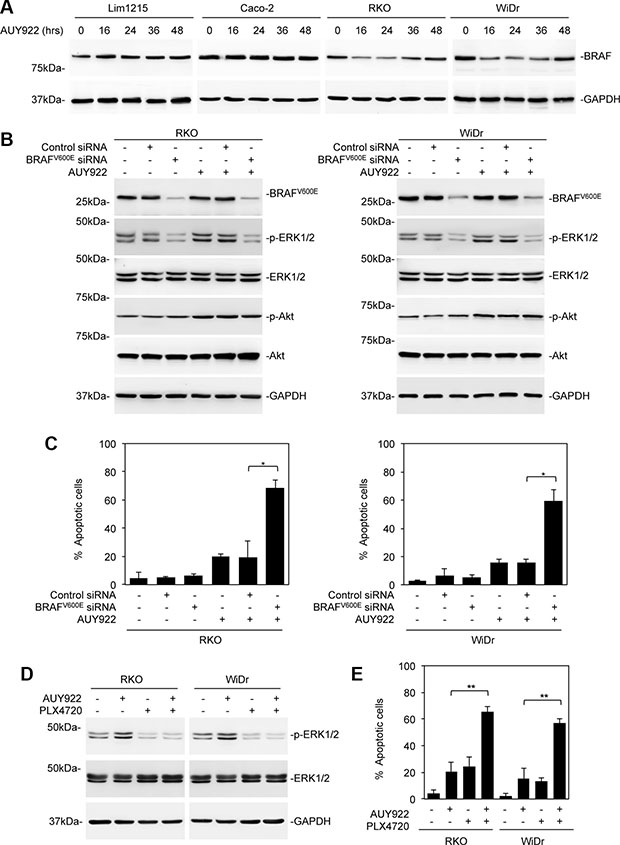 Figure 4: Reactivation of ERK in colon cancer cells after treatment with AUY922 is primarily due to persistent expression of mutant BRAF. (A) Whole cell lysates from Lim1215, Caco-2, RKO and WiDr treated with AUY922 (400 nM) for indicated time points were subjected to Western blot analysis. Data are representative, n = 3. (B) RKO (left) and WiDr (right) cells transfected with the control or BRAFV600E siRNA were treated with AUY922 (400nM) for 48 hours. Whole cell lysates were subjected to Western blot analysis. Data are representative, n = 3. (C) RKO (left) and WiDr (right) cells transfected with the control or BRAFV600E siRNA were treated with AUY922 (400 nM) for 48 hours. Apoptosis was measured by PI and Annexin V staining. Data are mean ± SE, n = 3. *P < 0.05, Student’s t-test. (D) Whole cell lysates from RKO and WiDr cells were treated with AUY922 (400 nM), and/or PLX4720 (3 μM) for 48 hours and subjected to Western blot analysis. Data are representative, n = 3. (E) RKO and WiDr cells were treated with AUY922 (400 nM), and/or PLX4720 (3 μM) for 48 hours. Apoptosis was measured by PI and Annexin V staining. Data are mean ± SE, n = 3. **P < 0.01 Student’s t-test.