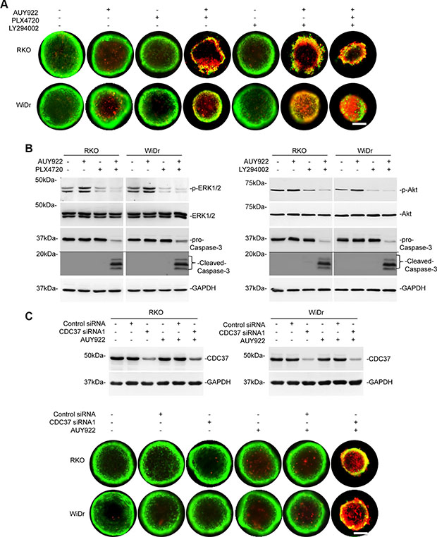 Figure 6: Mutant BRAF inhibitors, PI3K inhibitors, or knockdown of CDC37 overcomes resistance of colon cancer cells grown in 3-dimensional cultures to AUY922. (A) RKO and WiDr cells were seeded at 500 cells/well onto a 96-well Perfecta3-D® Hanging drop plate. Five days later, cells were stained with calcein AM and ethidium homodimer-1 for 24 hours followed by treatment with AUY922 (400 nM) and/or PLX4720 (3 μM) and LY294002 (40 μM) for 48 hours. Data are representative, n = 3. Scale bars, 25 μm. (B) RKO and WiDr cells were seeded at 500 cells/well onto a 96-well Perfecta3-D® Hanging drop plate. Five days later, cells were treated with AUY922 (400 nM) and/or PLX4720 (3 μM) (left) and LY294002 (40 μM) (right) for 48 hours. Whole cell lysates from 3-D spheres were subjected to Western blot analysis. Data are representative, n = 3. (C) Upper panel: RKO and WiDr cells transfected with the control or CDC37 siRNA1. Forty-eight hours later, five hundred cells were seeded onto a 96-well Perfecta3-D® Hanging drop plate. After 5 days, cells were treated with AUY922 (400 nM) for 48 hours. Whole cell lysates from 3-D spheres were subjected to Western blot analysis. Data are representative, n = 3. Lower panel: RKO and WiDr cells transfected with the control or CDC37 siRNA1. Five hundred cells were seeded onto a 96-well Perfecta3-D® Hanging drop plate. Five days later, cells were stained with calcein AM and ethidium homodimer-1 for 24 hours followed by treatment with AUY922 (400 nM) for 48 hours. Data are representative, n = 3. Scale bars, 25 μm.