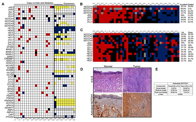 Figure 1: Activation of Notch pathway in early stage tongue squamous cell carcinoma. A. Schematic representation of somatic mutation, copy number changes and expression changes identified in Notch pathway genes (N=48) using whole exome and transcriptome sequencing. Red filled; copy number gains, Yellow; high transcript expression, blue; copy number loss and low transcript expression, black; mutation, white; no events, grey; transcript not detected and black borderline boxes ;any two events. Thick black line denoting separation of samples with exome and transcriptome sequencing. B. Schematic representation of DNA copy number alteration of Notch pathway genes in a cohort of 41 paired tumor samples estimated by quantitative real-time PCR. Red blocks; high copy number, blue; low copy number, black; diploid and grey color; experiment could not be done or data could not be acquired. C. Schematic representation of gene expression of Notch signaling pathway and its downstream targets in the cohort of 44 paired tongue tumor samples. Colors denotes: Red; upregulation, blue; down regulation, black; basal expression and grey color; experiment could not be done or results could not be acquired D. Immunohistochemistry (IHC) was performed for activated NOTCH1 in paired normal and tongue tumor samples (N=50). Brown color indicates positive expression. Representative IHC stained photomicrographs from normal and tongue tumor samples are shown. Scale bar, 100µM; corresponding H&E stained slides are shown in the upper panel. E. Tabular representation for quantification of activated NOTCH1 immunostaining data. Significant differences of IHC staining scores between normal and tumor were estimated using the Chi-square test and p value ≤0.05 was considered as threshold for statistical significance.