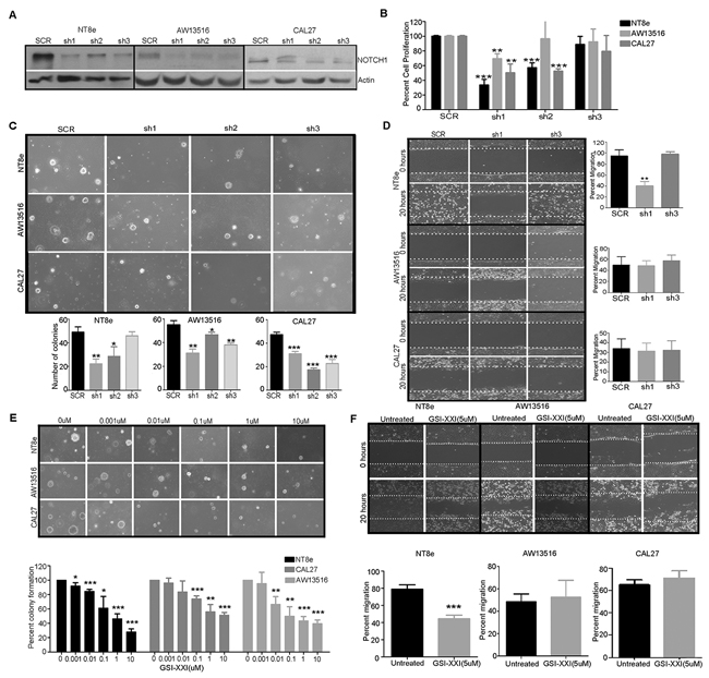 Figure 2: shRNA mediated knockdown and inhibition of NOTCH1 inhibits transformation, survival and migration of HNSCC cells. A. shRNA constructs used to knock down NOTCH1 expression in NT8e, AW13516, and CAL27 cells. Anti-NOTCH1 immunoblot shows that hairpins knock down to varying extents in different cells. Actin is included as a loading control. SCR, scrambled hairpin used as a negative control. B. Infection with 2 of 3 independent hairpins (shNOTCH1#1 and shNOTCH1#2) inhibited cell survival of NT8e and CAL27 cells expressing higher NOTCH1 levels as compared to the AW13516 cells-- as assessed by plotting total cell count on day 6 compared to day 2, normalized against cells infected with SCR. C. Infection with independent hairpins inhibit soft agar colony formation by the NT8e and CAL27 cells expressing higher NOTCH1 levels compared to the AW13516 cells (upper panel). Colonies were photographed after 3 weeks (Magnification: ×10). Bar graph representation of soft agar colony formation (lower panel). D. Wound healing assay of knockdown clones of NT8e, CAL27 and AW13516 cells. NT8e cells with highest migration potential was most significantly inhibited following infection with shNOTCH1 constructs. Percent inhibition of migration was calculated after 20 hours of wound incision. E. Representative images of soft agar colony formation (upper panel) and bar graph representation of soft agar colony formation post gamma secretase inhibitor (GSI-XXI) treatment in HNSCC cell lines F. Wound healing assay of NT8e, CAL27 and AW13516 cells were performed post GSI-XXI inhibitor as indicated concentration and % migration was calculated after 20 hours of wound healing. Experiment was performed in triplicate and colonies were counted and shown as mean ± SD and P value is denoted as *; P < 0.01, **; P < 0.001, ***; P < 0.0001 versus non-targeting shRNA. Experiments were repeated two times independently.