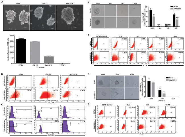 Ninety-six hundred cells were seeded in 1.2 % agar coated 6-well plates supplemented with stem cell media (recombinant EGF (20 ng/ml), human basic FGF (20 ng/ml), L-glutamine (2 mM), B-27 supplement and N2 supplement) and allowed to grow for 10 days. After every five days media, additional media was supplemented. Five hundred cells from NT8e, AW13516 and CAL27 shRNA clones were seeded on an ultra-low adherent 96-well plate in stem cell medium. Oralspheres were then cultured and maintained in low adherent 24-well plates. Additionally, the parent NT8e, AW13516, and CAL27 cells were also checked for the spheroid formation capacity upon 5 µM and 10 µM GSI-XXI administration using the same conditions.