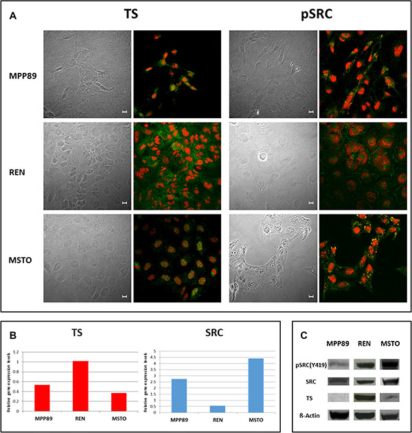 Figure 1: Basal TS, pSRC and SRC localization and expression in MPM cells. In all MPM cell lines analyzed, the subcellular distribution of both TS and pSRC was detected by confocal microscopy after immunostaining with anti-TS (FITC-green, left panel) and anti-pSRC (FITC-green, right panel). Propidium iodide was used to counter stain nuclei, and the images were overlaid to determine both TS and pSRC localization within the cell. Confocal series images were taken on an inverted Zeiss LSM510 microscope equipped with a Plan-Apochromat 63X/1.4 oil immersion Ph 3 objective (Oberkochen, Germany). Scale bars: 10 μm. (A). Basal TS and SRC genes expression was determined by means of quantitative Real Time PCR (B) and TS, SRC and pSRC protein expression was also detected using immunoblotting (C). BACT served as housekeeping control.