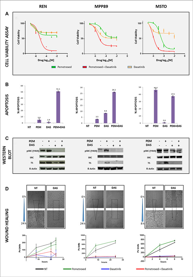 Figure 2: PEM and Dasatinib affect cell viability, apoptosis, TS and SRC protein levels and cell migration. PEM and dasatinib efficacy was established in all three MPM cell lines. REN and MPP89 (left and middle panels) were incubated with single and combination drugs for 72 hours, while 48 hours were sufficient for MSTO (right panel) (A). The apoptotic rate displayed differential responses, among MPM cells, to single and double treatments after 72 (left and middle graph) and 48 (right graph) hours, respectively (B). The same incubation times were applied to detect TS, SRC and pSRC protein expression (C). Wound healing assay was employed to determine the effect mediated by drugs on cell migration. Compared with untreated, dasatinib treatment abolished cell migration capability to heal the scrape after 24 hours in both REN and MPP89 cell lines (left and middle panels), and after 8 hours in MSTO (right panel). Plots display the progressive time-depending wound healing, in pixel units (px), under different drugs conditions (D).