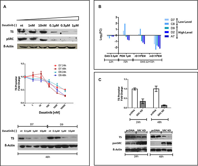 To better understand the specific involvement of SRC in this scenario, we transfected TS-promoter reporter gene, in the presence or absence of SRC dominant negative (K295M, kinase dead), as well as in presence of dasatinib. The expression of SRC dominant negative impaired luciferase activity, under control of TS-promoter, both at 24 and at 48 hours post transfection, indicating direct regulation of SRC on TS promoter (Figure 3C). The effect of SRC dominant negative was evident also at the protein level, reducing endogenous TS protein (Figure 3C). These results, independent by dasatinib use, clearly demonstrate that SRC controls TS expression through transcriptional regulation.