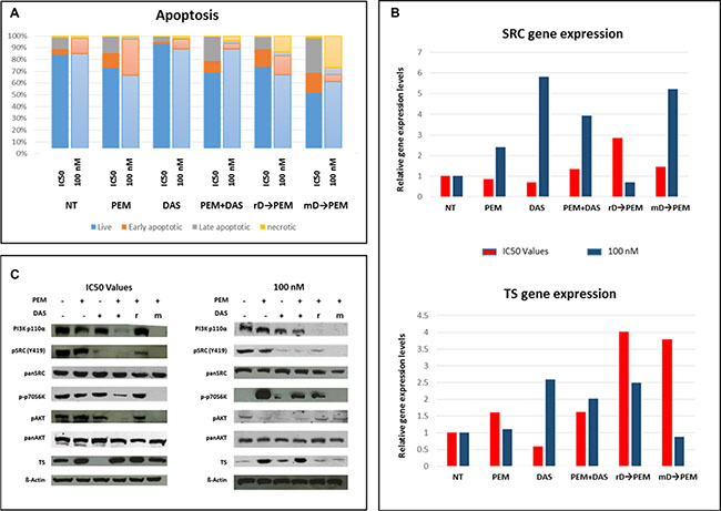Figure 4: Dasatinib pretreatment effects on apoptosis, target expression and PI3K-Akt-mTOR pathway. Upon single agents (PEM and dasatinib), combination and sequential treatments characterized by both, removal (rD→PEM) and maintained (mD→PEM), dasatinib pretreatment apoptosis rate was evaluated. Single and combined treatments were performed for 72 hours, sequential administrations at 72 (dasatinib pretreatment) + 72 hours (PEM incubation). The data are the results of three independent biological experiments for each concentration setting (IC50 & 100 nM) (A). TS and SRC genes expression was assessed for all the conditions tested in the study: IC50 (red) and 100 nM (blue). While TS gene was upregulated when sequential treatments with IC50 doses of both drugs were employed, the modulation of SRC gene expression more pronounced at 100 nM dose (B). Both, combined and mD→PEM treatments at IC50 values downregulated the expression and the activation of the PI3K-AKT-mTOR signaling players analysed. Noteworthy, none of the conditions assayed was able to reduce TS expression levels. On the contrary sequential treatments, at 100 nM, led to TS downregulation (r = rD; m = mD) (C).