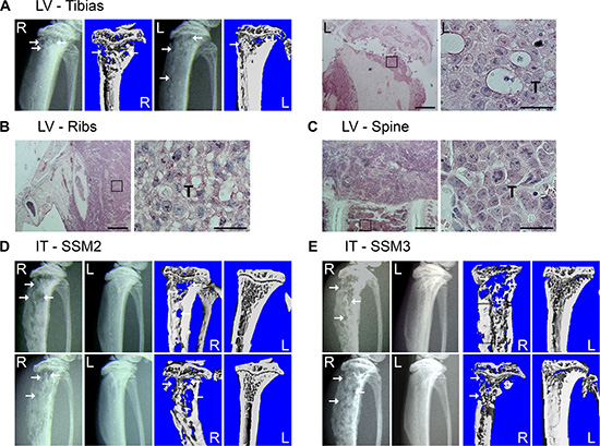 Figure 1: SSM2 and SSM3 cells develop osteolytic metastasis in immunocompetent female mice. (A–C) 105 SSM2 cells were injected into the left ventricle (LV) of WT immunocompetent female mice (n = 5) and development of bone metastasis was monitored by X-ray and viva-CT scans in the tibias, or by histology of the tibias, ribs and spine at time of sacrifice. (A) Representative X-ray images and viva-CT scans of the right (R) and left (L) tibias 48 days post-tumor cell injection. Arrows pointing to osteolytic lesions. H&E staining (original magnification, 2×. Scale bar = 500 μm. Insets showing SSM2 tumor cells at 60 × magnification) of the left tibia (A), ribs (B) and spine (C). Presence of SSM2 cells is indicated by T. (D–E) 105 SSM2 or SSM3 cells were injected into the right tibia (IT) of WT female mice (n = 6/group). Representative X-ray and viva-CT images of the tumor-injected tibia (R) and the control non-injected tibia (L) 28 days post tumor inoculation. Arrows pointing to osteolytic lesions.