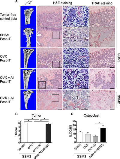 Figure 3: inhibition of peripheral estrogen synthesis does not prevent development of SSM2 tumor in bone. (A) Representative H&E staining sections (original magnification, 10×. Scale bar = 100 μm. 60× magnification, scale bar = 25 μm) at 4 weeks post tumor cell inoculation. Presence of tumor cells is indicated by T. 105 SSM2 cells were injected into the right tibia of WT female mice (n = 3/ group), one week after SHAM- or OVX- surgery. In addition to OVX, one group (n = 3/group) received aromatase inhibitor (AI) for 4 weeks. Representative TRAP staining is shown (original magnification, 10×. Scale bar = 100 μm). As control, representative H&E and TRAP staining is shown on sections from tumor-free tibia. (B) Tumor grade score from 0 to 5 showing displacement of marrow by tumor, with 0 indicating no tumor and 5 100% tumor in the bone marrow. Data are represented as mean +/− sem. No statistical differences were observed between groups. (C) Number of osteoclasts (OC) per bone surface is shown for SHAM, OVX and OVX + AI groups. Data are represented as mean +/− sem. No statistical differences were observed between groups.