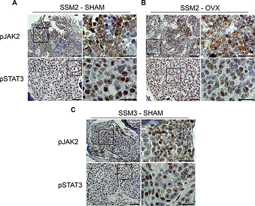 Figure 6: Bone residing SSM2 and SSM3 cells express pJAK2 and pSTAT3. (A–C) SSM2 and SSM3 tumors in tibias of SHAM-operated (A, C) or OVX (B) female mice were subjected to immunohistochemistry to detect pJAK2 and pSTAT3 expression. Representative images (original magnification, 20×. Scale bar = 50 μm. Insets, 60× magnification, scale bar = 25 μm) from 1 out of 5 mice per group are shown.