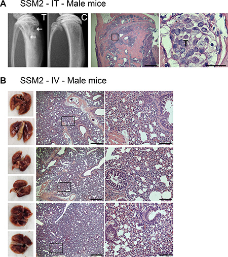 Figure 7: ERα+/PR+ SSM2 cells establish bone but not lung metastasis in male mice. (A) 105 SSM2 cells were injected into the right tibia (IT) of WT male mice (n = 5). Mice were sacrificed 30 days post tumor inoculation. Representative X-ray images of the tumor-injected tibia (T) showing lytic lesions (arrows) and non-injected control tibia (C) are shown. Presence of tumor cells in bone is depicted by T on histological sections stained for H&E (original magnification, 2×. Scale bar = 500 μm. Insets showing the presence of SSM2 tumor cells at 60× magnification, scale bar = 25 μm). (B) 5 × 105 SSM2 cells were injected into the tail vein (IV) of WT male mice (n = 5). Mice were sacrificed 30 days post tumor inoculation. 3/5 representative images of fixed lungs and histological sections stained for H&E are shown (original magnification, 2×. Scale bar = 500 μm. Insets, 10× magnification, scale bar = 100 μm).