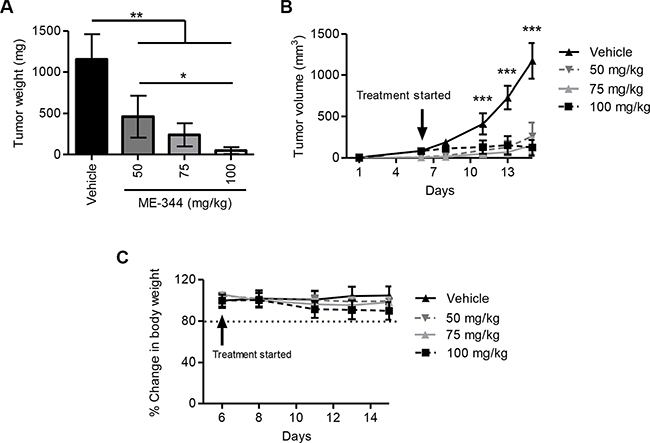 Figure 2: ME-344 displays antitumor activity in an in vivo xenograft mouse model. Tumor derived OCI-AML2 human leukemia cells (1 × 106) were injected subcutaneously into the flanks of male SCID mice. When tumors were palpable, animals were separated into four groups and were treated with ME-344 by i.p. injection (50, 75, and 100 mg/kg every other day) or vehicle control (n = 8 per group). Tumor weight (A), tumor volume (B), and body weight (C) were monitored over time. Mean ± SD; the lines are connecting the data points. *P < 0.01, **P < 0.001, and ***P < 0.0001 from a one-way ANOVA in panel (A) and a two-way ANOVA with Bonferroni posttests comparing all treatment groups in panel (B).