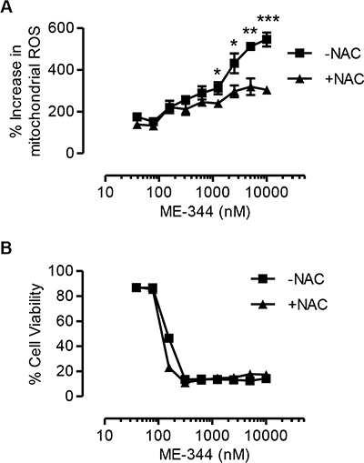 Figure 3: Antioxidant treatment does not rescue cell death induced by ME-344. OCI-AML2 cells were treated with increasing concentrations of ME-344 alone, and ME-344 with 5 mM NAC simultaneously for 72 hours. Accumulation of mitochondrial ROS was assessed by flow cytometry using Mitosox staining (A), and cell viability was measured by 7-AAD staining (B). Data represent mean ± SD of three independent experiments. The lines are connecting the data points. *P < 0.05, **P < 0.01 and ***P < 0.001 from Student’s t-test by comparing the means at a given concentration of ME-344.