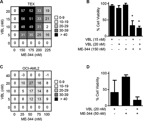 Figure 5: ME-344 synergizes with vinblastine in TEX cells and OCI-AML2 cells. (A and B) TEX and (C and D) OCI-AML2 cells were treated with the indicated concentrations of ME-344 and vinblastine (VBL) simultaneously. Cell viability was assessed using the MTS assay after 72 hours. Excess Over Bliss values above 10 were assigned as being synergistic. Representative synergistic combinations in TEX (B) and in OCI-AML2 (D) are shown. *P < 0.0001 from one-way ANOVA. Data represent mean ± SD of three independent experiments.
