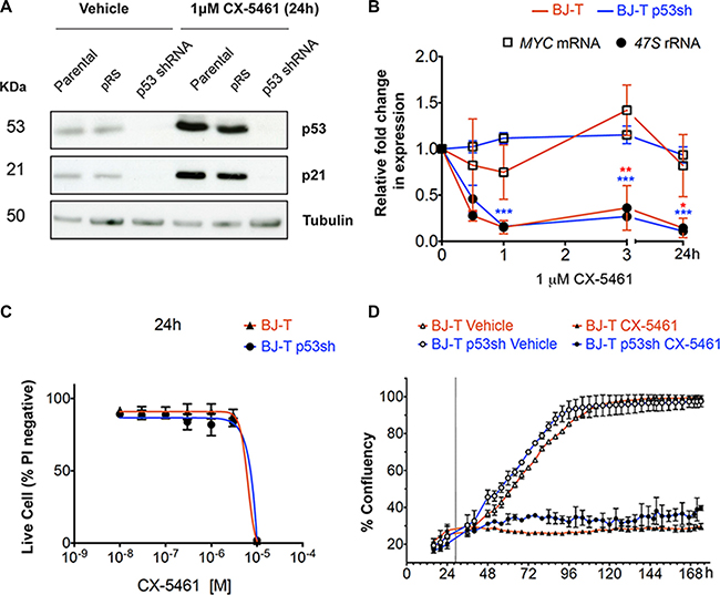 Figure 1: BJ-T fibroblasts undergo p53-independent proliferation defect following inhibition of Pol I transcription initiation by CX-5461. (A) Western blot analysis of p53, p21 and tubulin protein levels in parental BJ-T cells and BJ-T cell lines transduced with empty vector (pRS) or p53 shRNA-pRS treated with 1 μM CX-5461 for 24 h (representative of n = 3). (B) BJ-T (red line) and BJ-T p53sh cells (blue line) were treated with either vehicle or 1 μM CX-5461 for the indicated times. RNA was extracted and the levels of 47S rRNA precursor (dark circle) and MYC mRNA (empty square) were determined using reverse transcription qPCR. Expression levels were normalized to Vimentin mRNA and expressed as fold change relative to vehicle t = 0 (n = 3), error bars represent mean ± s.e.m, *p-value < 0.05, **p-value < 0.01, ***p-value < 0.001, compared to vehicle t = 0 samples. (C) Propidium iodide (PI) exclusion assay to determine the percentage (%) of live cells of the BJ-T (n = 2) and BJ-T p53sh (n = 2) cell lines treated with CX-5461 as indicated. Error bars represent mean ± s.d. (D) Proliferation time course of BJ-T and BJ-T p53sh cell lines determined by percentage confluency using IncuCyte ZOOM of the BJ-T and BJ-T p53sh cell lines. Dashed line indicates the addition of vehicle or 1 μM CX-5461. Error bars represent mean ± s.d. of 2 technical replicates (representative of n = 6).