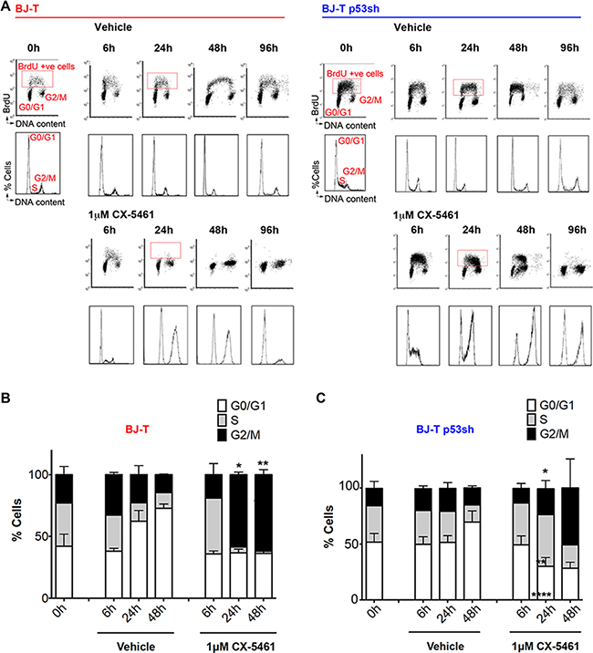 Figure 2: BJ-T and BJ-T p53sh cells exhibit G1 arrest, S-phase delay and G2 cell cycle arrest in response to CX-5461. (A) Cell Cycle analysis of BJ-T (left panel) and BJ-T p53sh (right panel) treated with vehicle or 1 μM CX-5461 for the indicated times and labeled with BrdU for 30 min prior to harvest. (Top Panel) Analytical FACS analysis showing BrdU incorporation as a function of DNA content. The boxes represent S-phase BrdU-labeled populations. G0/G1 and G2M cell populations are indicated. (Bottom panels) Histogram plots for total cells stained with PI from the corresponding BrdU-labeled cells shown in top panels. Cell cycle analysis using PI for DNA content of BJ-T (B) BJ-T p53sh cells (C) treated with CX-5461 as indicated and stained with PI. The percentage of cells in G0/G1, S and G2/M phases were determined using Modfit 3.0 software. BJ-T cells displayed a significant increase in G2/M cells following 24 h to 48 h of treatment with CX-5461 relative to corresponding vehicle treated samples (n = 3), error bars represent mean ± s.e.m, *p < 0.05, **p-value < 0.01. BJ-T p53sh cells displayed significant increases in S-phase cells (**p-value < 0.01) and G2/M (*p < 0.05) as well as significant decreases in the G1 populations (****p-value < 0.0001) following 24 h treatment with CX-5461 relative to vehicle treated samples (n = 6), error bars represent mean ± s.e.m.