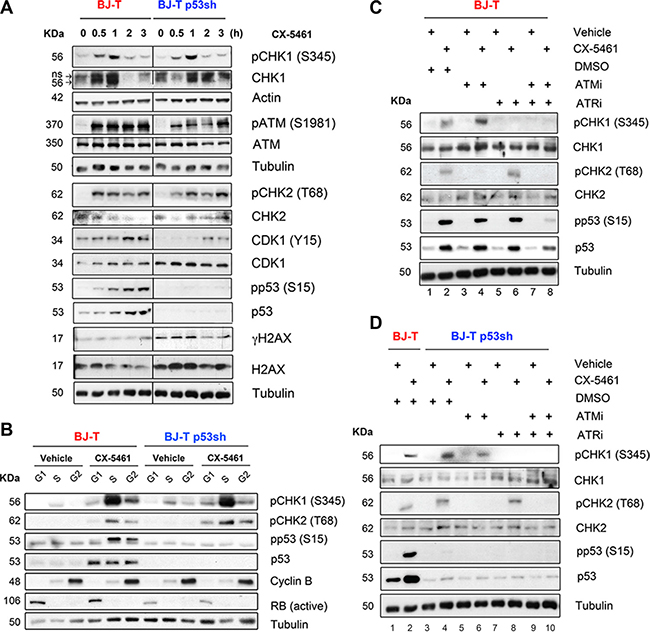 Figure 3: Inhibition of Pol I transcription initiation by CX-5461 activates the ATM/ATR signaling pathway. (A) Western blot analysis of BJ-T and BJ-T p53sh cell lines treated with either vehicle (0 h) or 1 μM CX-5461 for the indicated time course. Total protein lysates were extracted and western blot analysis was carried out with the indicated antibodies against phosphorylated and total ATM, CHK1, CHK2, CDK1 and H2AX proteins and antibodies that detect actin and Tubulin protein levels. (B) BJ-T and BJ-p53sh cells were treated with either vehicle or 1 μM CX-5461 for 2 h then collected and incubated with Vybrant DyeCycle Violet stain (Life Technologies). Cells were sorted using BD FACS Aria, into G1 and S phase and G2/M populations based on DNA content and total protein lysates were extracted. Western blot analysis was performed to examine phosphorylation levels of p53, CHK1 and CHK2 proteins as well as total p53 and Tubulin. Active RB and Cyclin B levels were used as quality control markers for G1 and G2 populations. The reduction in active RB levels in BJ-T p53shRNA cells is likely due to the fact that RB is a transcriptional target of p53 [83]. (C) BJ-T and (D) BJ-T p53sh cells were pretreated for 30 min with either DMSO, 5 μM KU-5593 (ATMi), 5 μM VE-821 (ATRi) or 5 μM ATMi/ 5 μM ATRi before vehicle or 1 μM CX-5461 were added to the cultures for further 2 h. Western blot analysis for phosphorylated and total CHK1, CHK2 and p53 were performed. All experiments in A-D are representatives of n = 3.