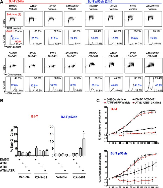 Figure 4: Combination treatment of ATM and ATR inhibitors with CX-5461 induces cell death in the absence of p53. (A) Cell Cycle analysis of BJ-T cells (left panel) and BJ-T p53sh cells (right panel) following 24 h of treatment with either vehicle or 1 μM CX-5461 in combination with either DMSO, 5 μM ATMi, 5 μM ATRi or 5 μM ATMi/ 5 μM ATRi. BrdU incorporation analysis (upper panels) and PI staining for DNA content (lower panels) were performed as described in Figure 2A. The percentages of live cells in G0–G1, S, and G2–M phases were determined using Modfit 3.0 software (representatives of n = 3). (B) Quantitation of cell death from (A), determined by subG1 DNA content analysis using FCS Express software (n = 3), error bars represent mean ± s.e.m, *p-value < 0.05 relative to CX-5461 treated BJ-T p53sh cells. (C) Proliferation time course using IncuCyte ZOOM of BJ-T and BJ-T p53sh cells treated with vehicle or 100 nM CX-5461 in the presence of DMSO or (5 μM ATMi/5 μM ATRi). Confluency values was normalised to percentage confluency at time 0h (n = 3), error bars represent mean ± s.e.m.